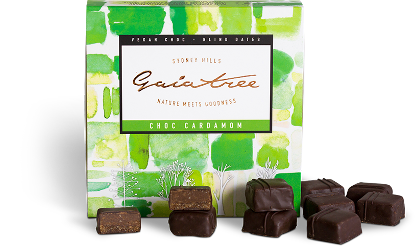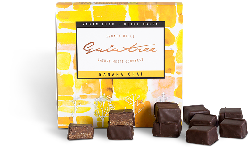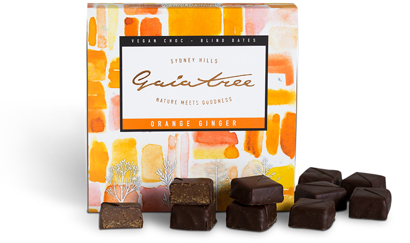 Gaia Tree Blind Dates are vegan dark chocolate squares with a dual layer almond and date centre consisting of a smooth praline layer and a nutty, biscuity base. Orange Ginger Blind Dates are flavoured with natural orange oil and powdered ginger.